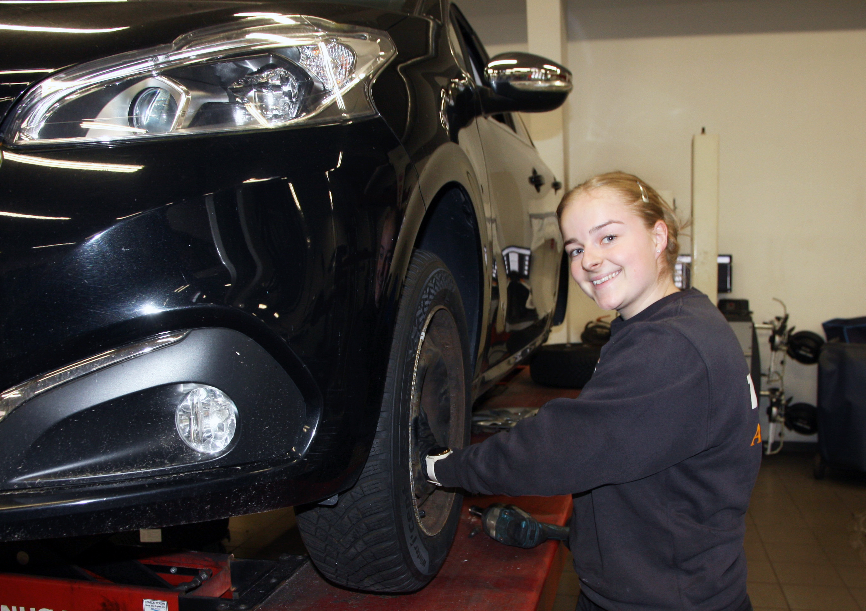 Sådan lyder det fra PF Biler i Harlev hvor 18-årige Josephines smil lyser op ved en af værkstedsliftene mens hun er i færd med at skifte hjul på en bil.