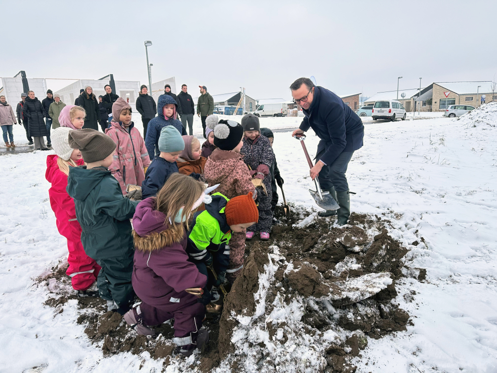 Byggeriet blev sat officielt i gang med første spadestik fra borgmester Frands Fischer og en række børn fra Børnehuset Viften, der ligger nær den kommende nye børneinstitution.