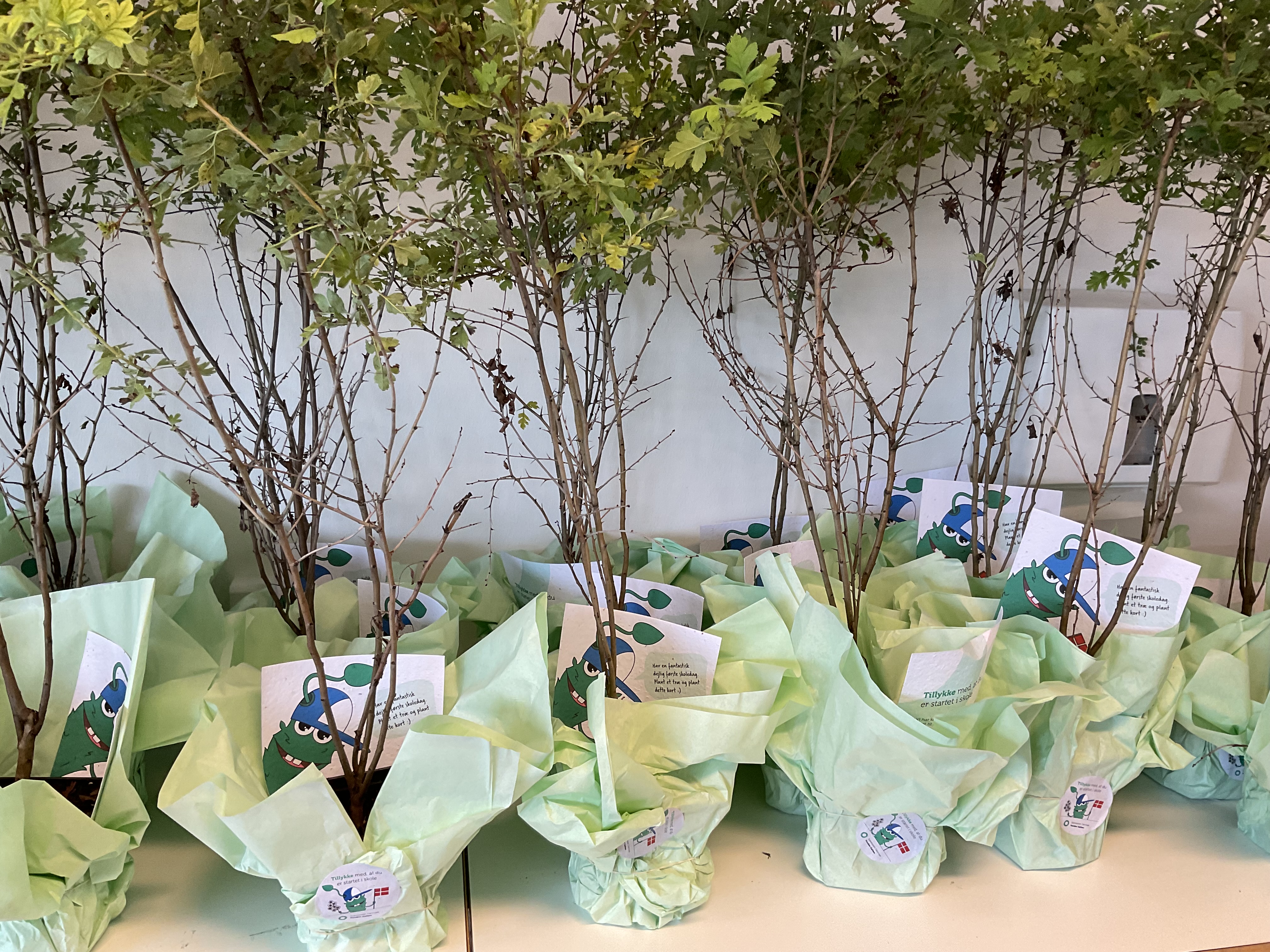 Igen i år bliver de nye elever, der starter i 0. klasse på Gyvelhøjskolen, Skovbyskolen og Den Fri Hestehaveskole mødt velkommen i skole med et Hvidtjørn-træ i potte på deres plads.