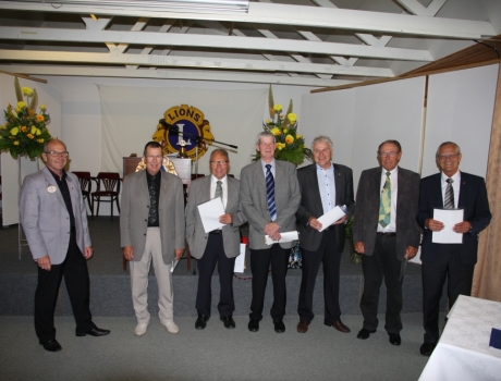 Distriktsguvernør Jimmy Nonbo (t.v.) hædrede de seks nuværende løver, der stadig er aktive blandt medlemmerne i den lokale løveklub. Det er fra venstre Per Kolding, Villy Rasmussen, Jørgen Berntsen, Bjarne Bertlesen, Aage Svinth og Jørn Andersen.