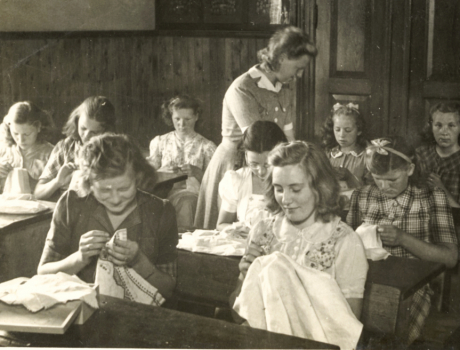 1947: Sytime på Klank med lærerinde Karen Holm, Skjørring.