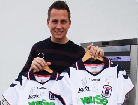 Kenneth Beck med de signerede AGF-spillertrøjer som er sat på auktion i forbindelse med AGF-eventen på Gyvelhøjskolen (se annonce side 10). Der er allerede indkommet de første bud, så også den del vil bidrage til at hæve indsamlingsbeløbet til fordel for Danmarks Indsamlingen.