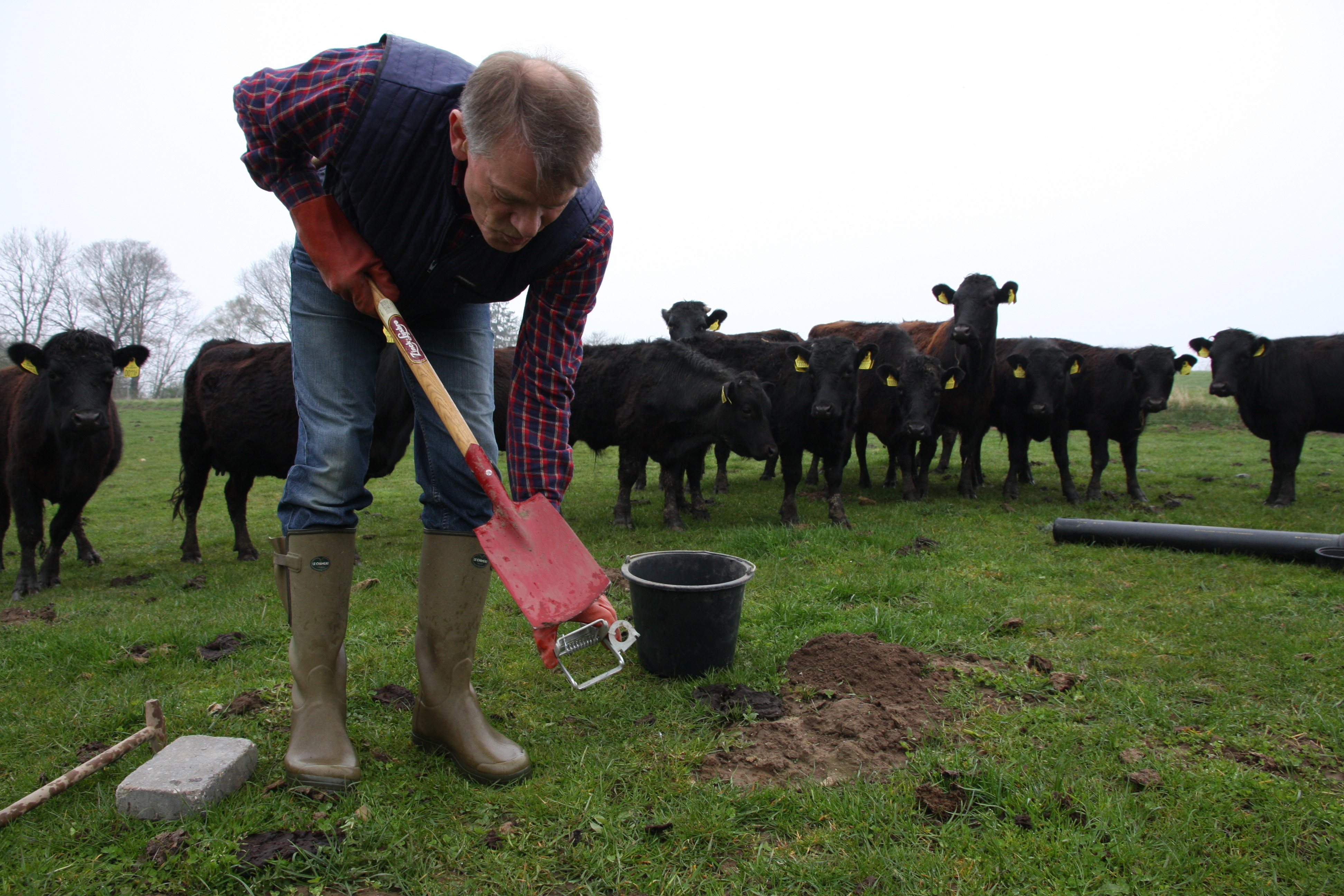 Per Dalsgaard ved om nogen, hvordan man bliver fri for muldvarpeskud på sin græsplæne. Her demonstrerer han til ære for fotografen den ene af de metoder han bruger (fældefangst), alt imens han nøje iagttages af sine køer.