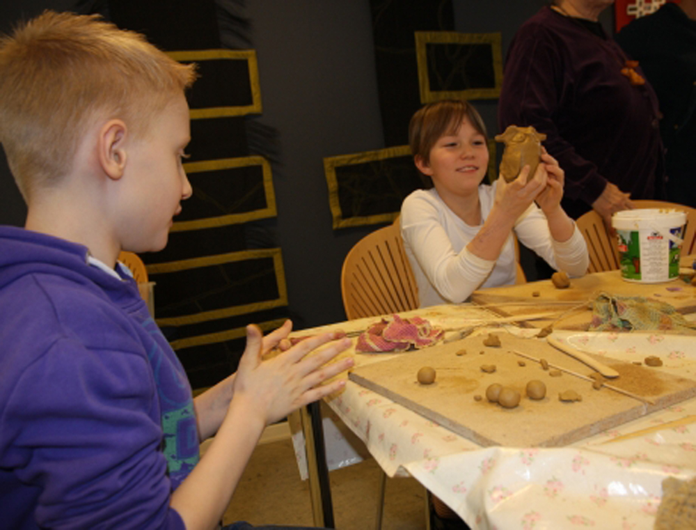 Matthias på 10 år og Michelle på 9 år hyggede sig med at lege med ler. Michelle er i gang med at forme en ugle, og Matthias har taget udfordringen op med at lave en bil.