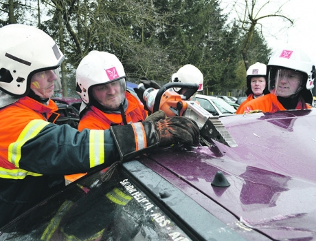 Denne lørdag øves rutiner i forbindelse med et færdselsuheld, herunder håndtering af værktøjer til frigørelse af fastklemte personer.