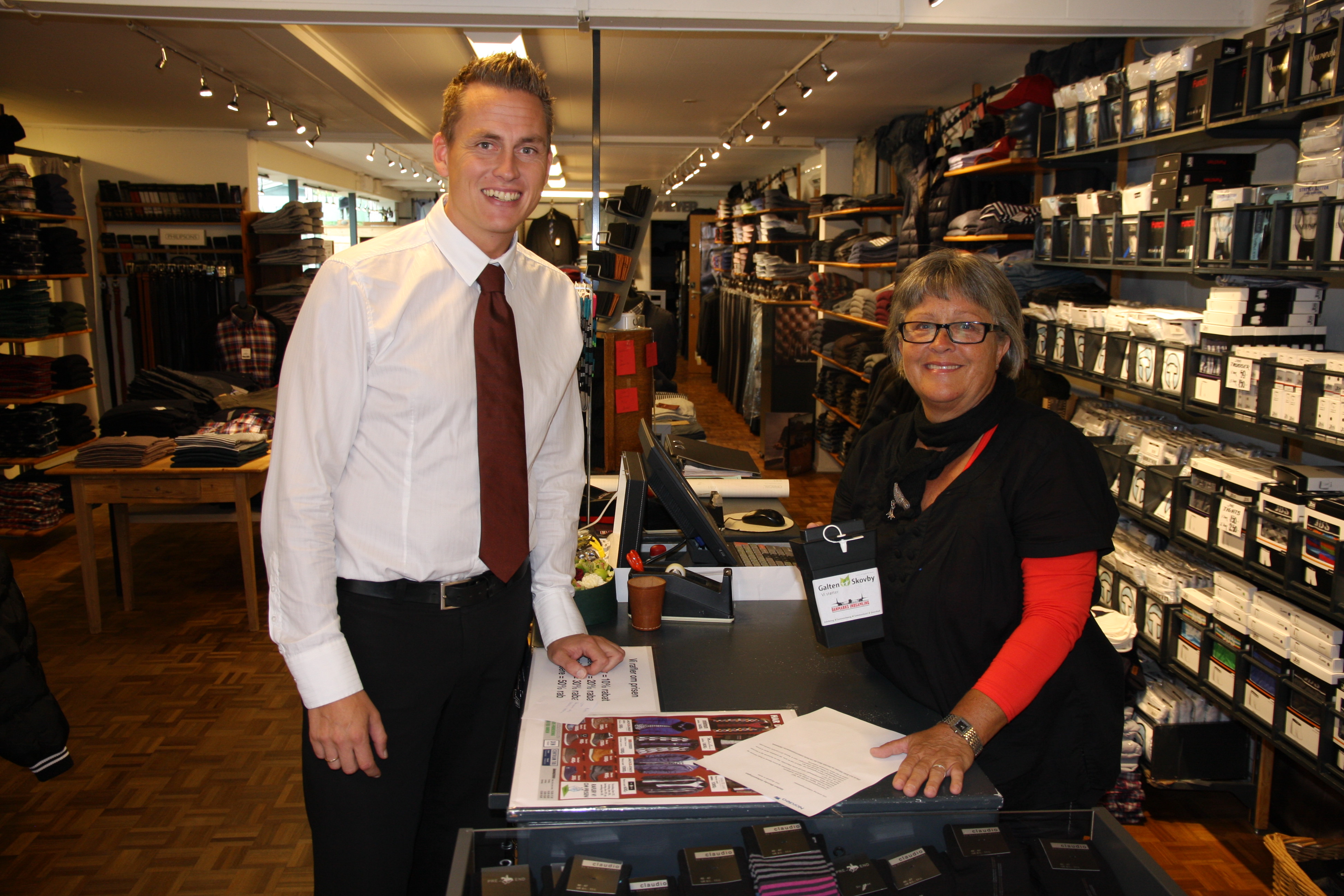 Kenneth Beck fra GMF's bestyrelse og samtidig initiativgruppen bag Galten-Skovbys byindsamling var forleden rundt i lokale butikker for at udlevere de plomberede indsamlingsbøsser, hvor kunderne frem til februar har mulighed for at give et kontant bidrag, når de er ude at handle. Her får Jette Jensen, Centrum Tøj udleveret en indsamlingsbøsse.
