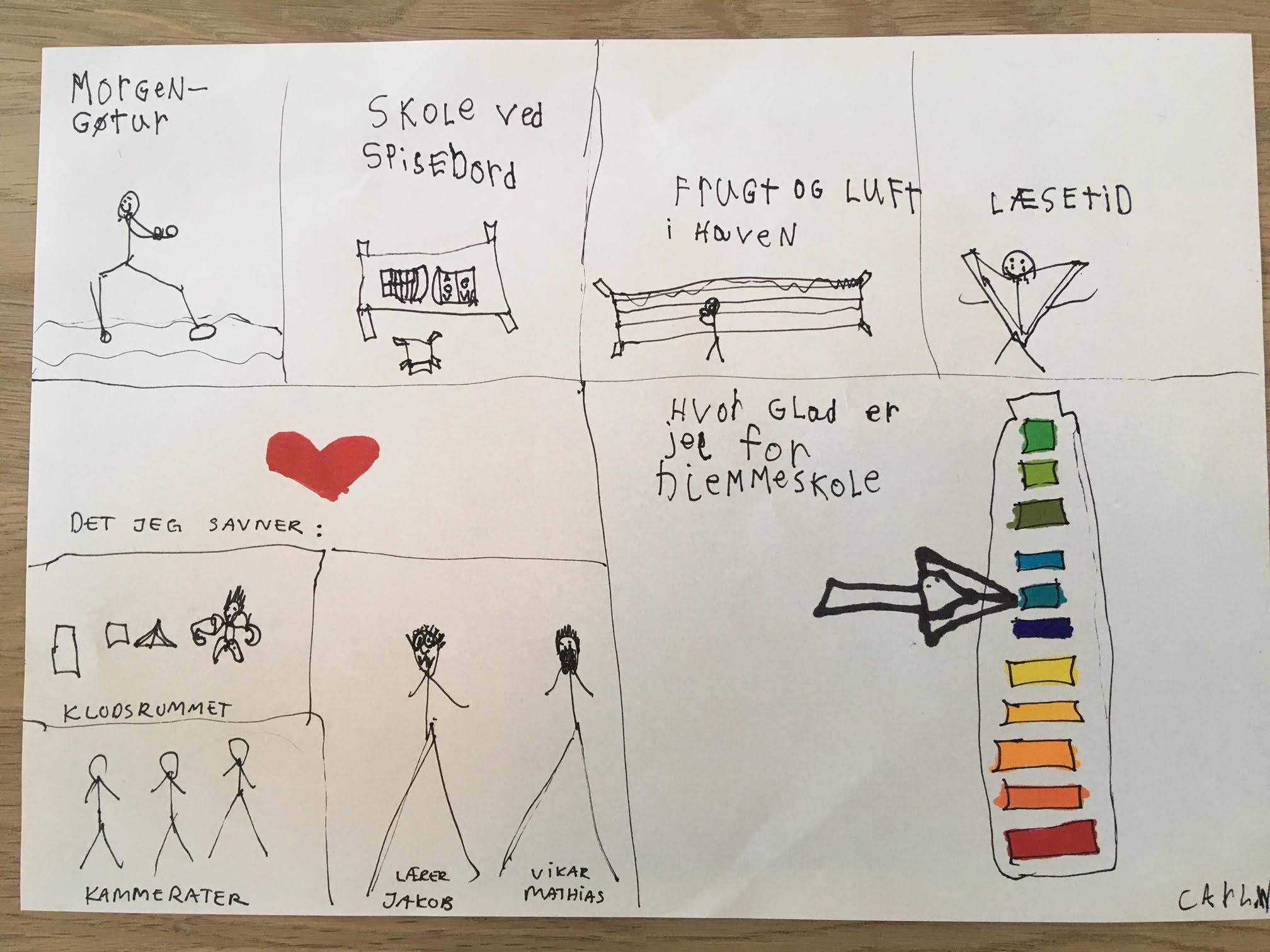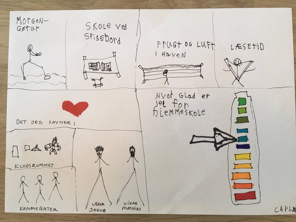 Elev i 1. klasse på Veng Skole har lavet en dagbogstegning af sin hverdag i hjemmeskole under corona-epidemien.