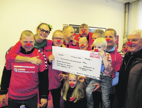 Checken på de 43.600 kroner blev sædvanen tro afleveret med højt humør på Aarhus Sygehus, og delegationen fra Galten blev budt varmt velkommen af hospitalsklovnene.
