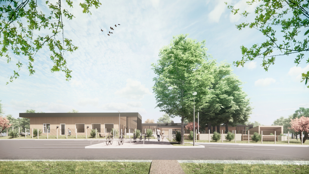 Børnehuset Horsegaard i Galten bliver placeret på Skjørringvej 9. Her ses illustration over hovedindgangen, som den formentlig kommer til at se ud. Illustration: Pluskontoret Arkitekter.