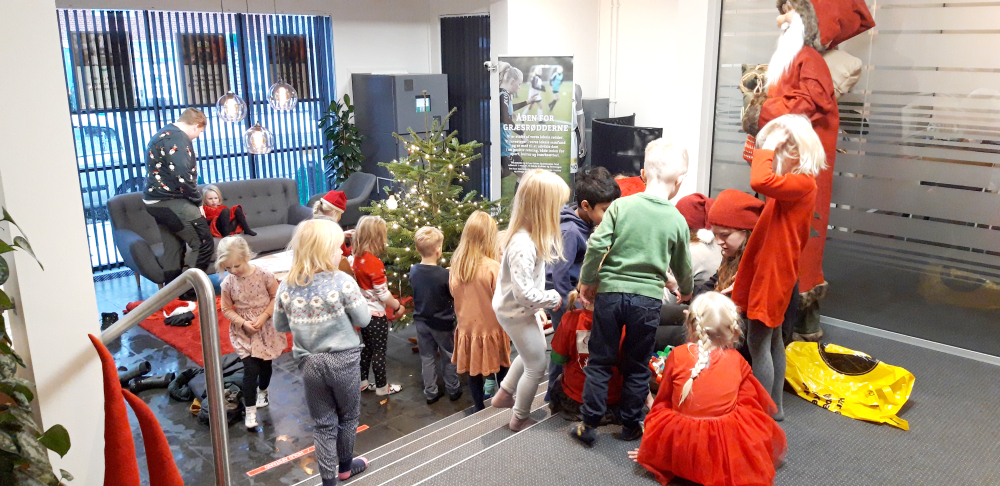 Med stort gåpåmod kaster børn fra Galten Børnehave og Vuggestue sig over den årlige opgave med at pynte op til jul hos Sparekassen Danmark – både inde og ude.