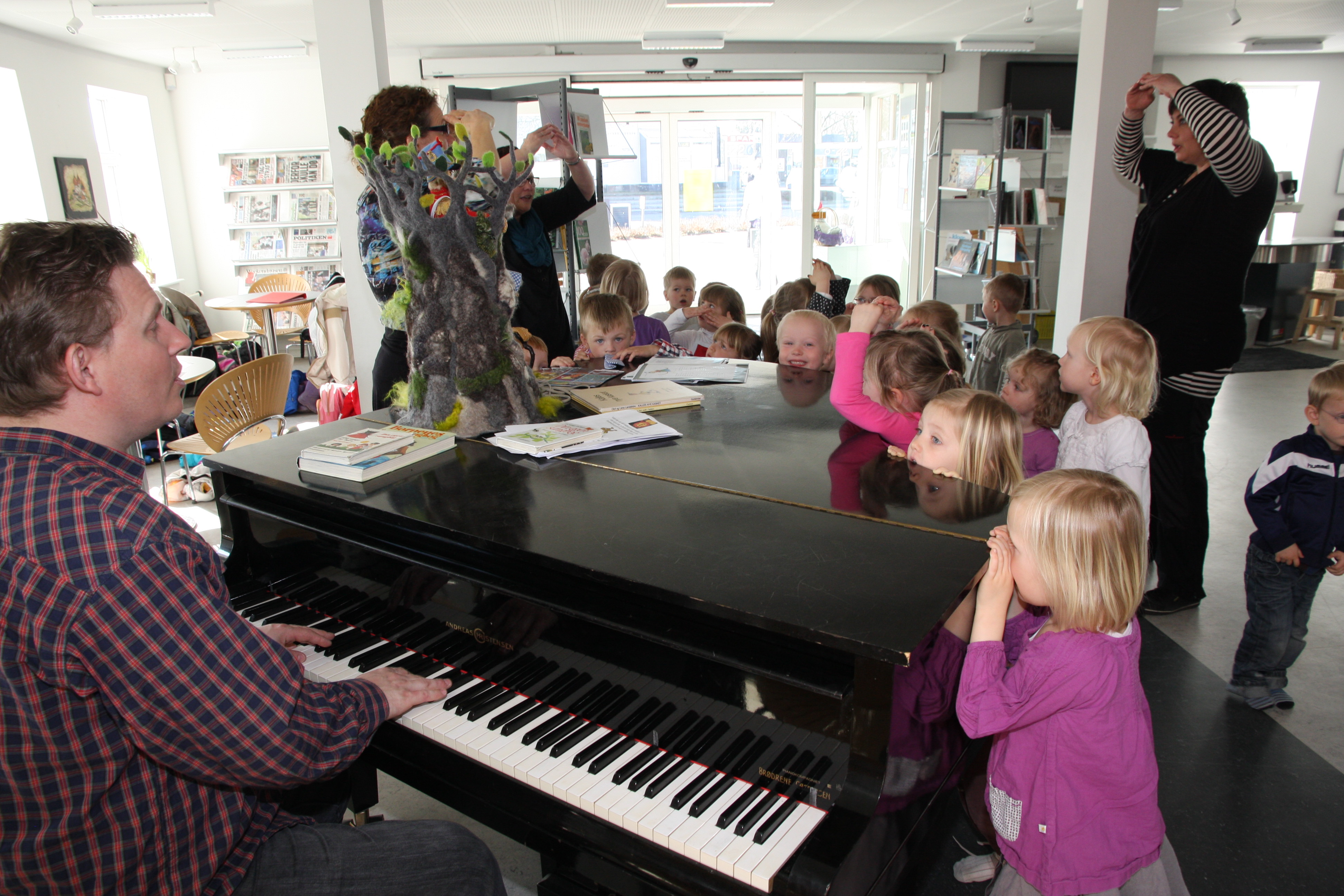 Steen Frederiksen fra Låsby vil lørdag formiddag sørge for loungemusik fra Galten Biblioteks flygel. Her ses han ved tangenterner i forbindelse med et børnearrangement i marts.