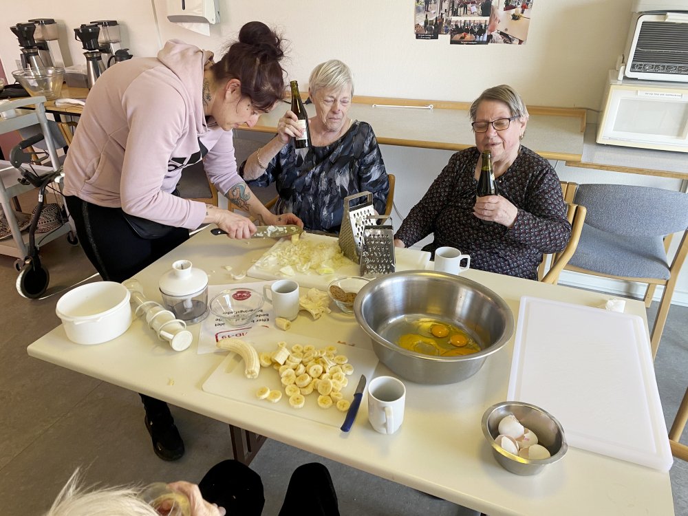 For nogle af beboerne smagte dagens måltid ekstra godt, for de havde nemlig selv været med til at tilberede maden. Menuen stod på frikadeller, brun sovs og råkost efterfulgt af en frugtsalat med hjemmeskåret frugt og chokolade.