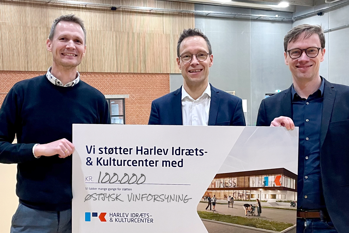 Donationer på 25.000 kr. fra duo bag Harlev Kalender, og 100.000 kr. Østjysk Vinforsyning overrakt til Harlev Idræts- & Kulturcenter.