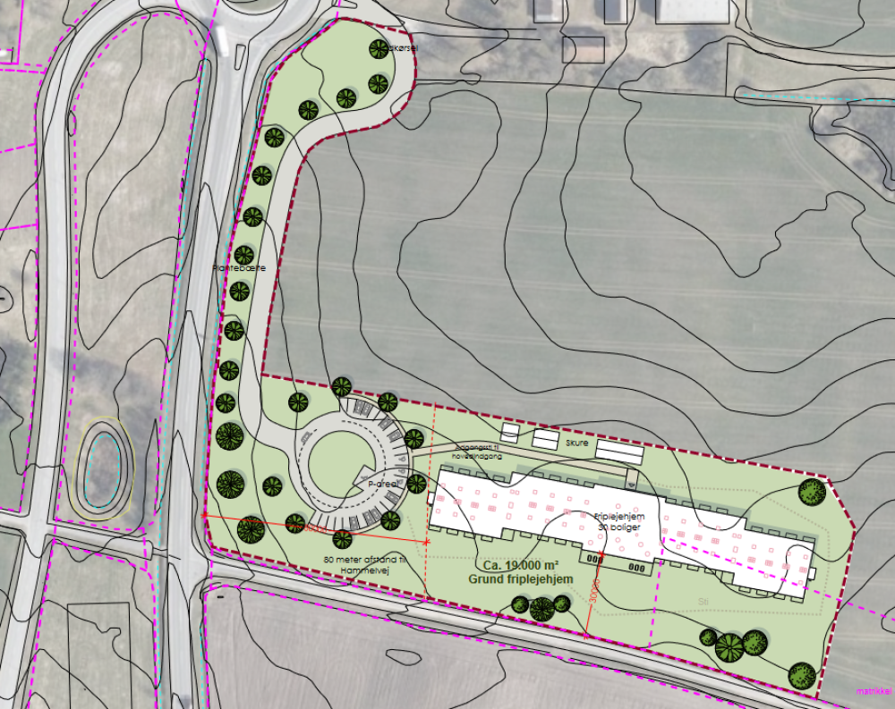 Friplejehjemmet vil få indkørsel fra rundkørslen på Hammelvej i Låsbys nordøstlige udkant og bygges langs Elleskovvej i en afstand til Hammelvej, som opfylder gældende støjkrav.