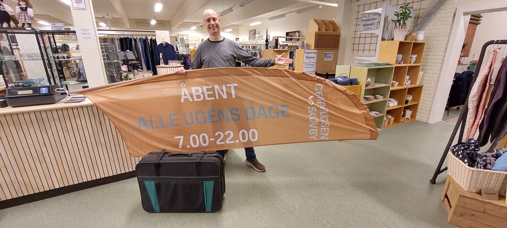 »Vi er blevet bedt om at finde remedier til de unge, som nu har startet deres egen virksomhed som bager, frisør, snedker, tømre, syerske og lignende. Derfor har jeg fyldt kufferten med frisørsakse/sæt, spejle, bageforme, kageruller og lignende som er kommet ind her i Skovby Genbrugs,« fortæller Dennis.