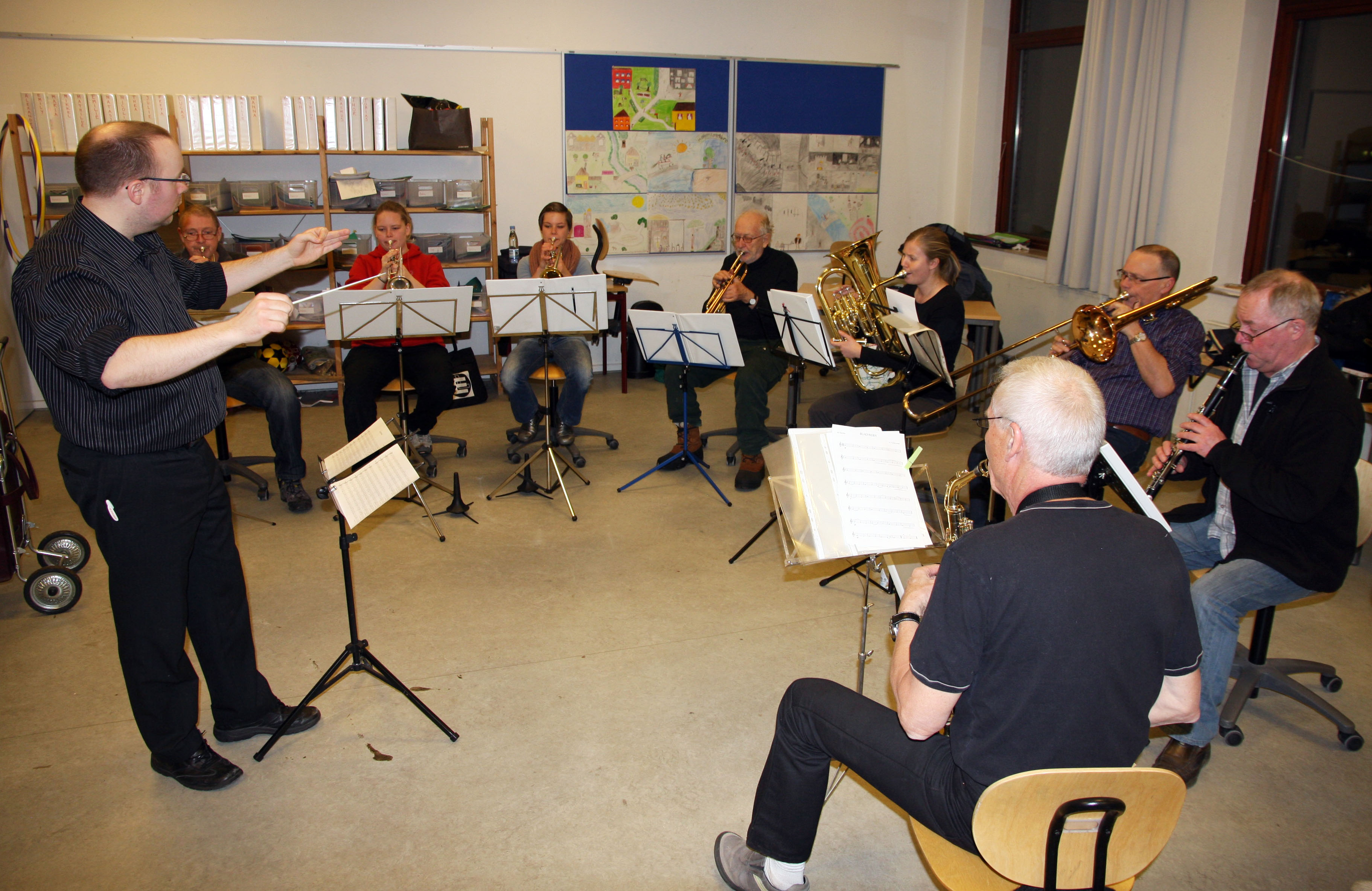 11 musikere og dirigent er samlet på Gyvelhøjskolen til den første øveaften.