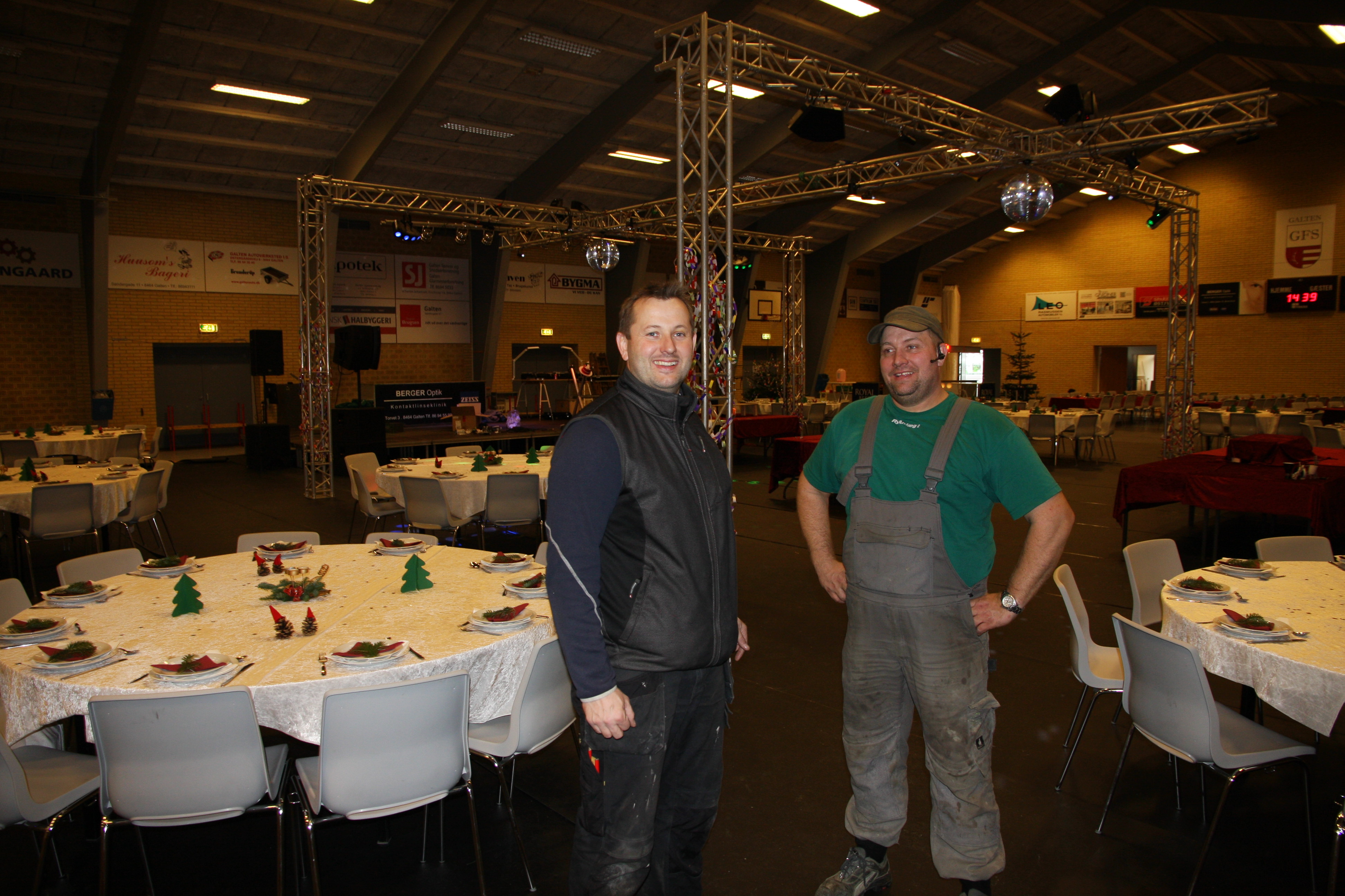 Et par timer før det store rykind var blandt andre Christian Berger og Jan Andersen færdige med at omdanne Galten-hallen til en festlig julefrokost-kulisse.