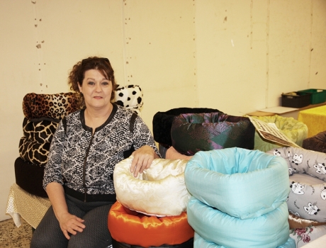 Brita Rodam, stifter af Hittekat.dk, ses her med sine "nullerputsenge" som hun selv syr til kattene.