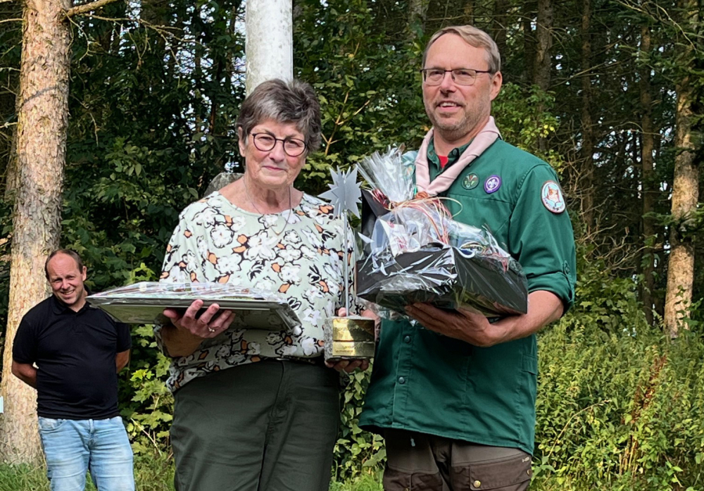 EDC Aros havde sponsoreret skilte til Nordstjernen samt en gavekurv, og i dagens anledning havde Anna Margrethe bagt en grøn kage pyntet med spejdersymboler og karamelsnører lavet til råbåndsknob.