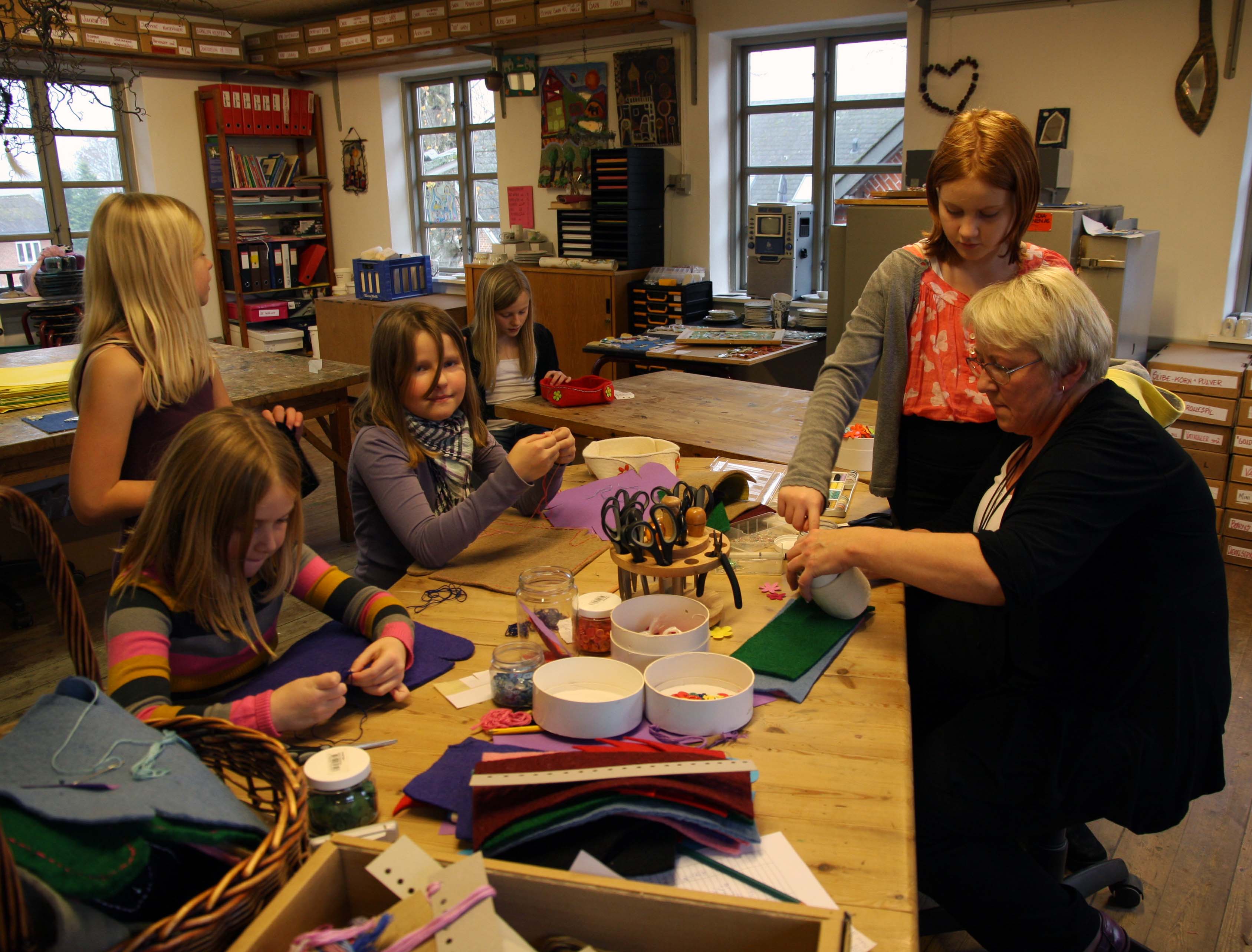 Sakse, knapper, filt, nåle og sytråd i alverdens farver ligger til rådighed på bordet i GJUK's hobbylokale. I øjeblikket laves flotte filtbrødbakker tiltænkt julegaver til forældre og bedsteforældre. Det kræver tydeligvis en vis mængde tålmodighed og fordybelse, for de filtede brødbakker dekoreres med farvestrålende syninger, filtblomster, perler og knapper, og de får hver sit unikke udtryk - perfekt til den personlige julegave.