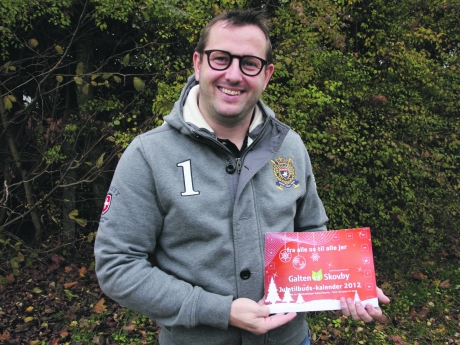 Christian Berger med julekalenderen som har bidraget med 70.000 kroner til Galten-Skovby Byindsamlingen.