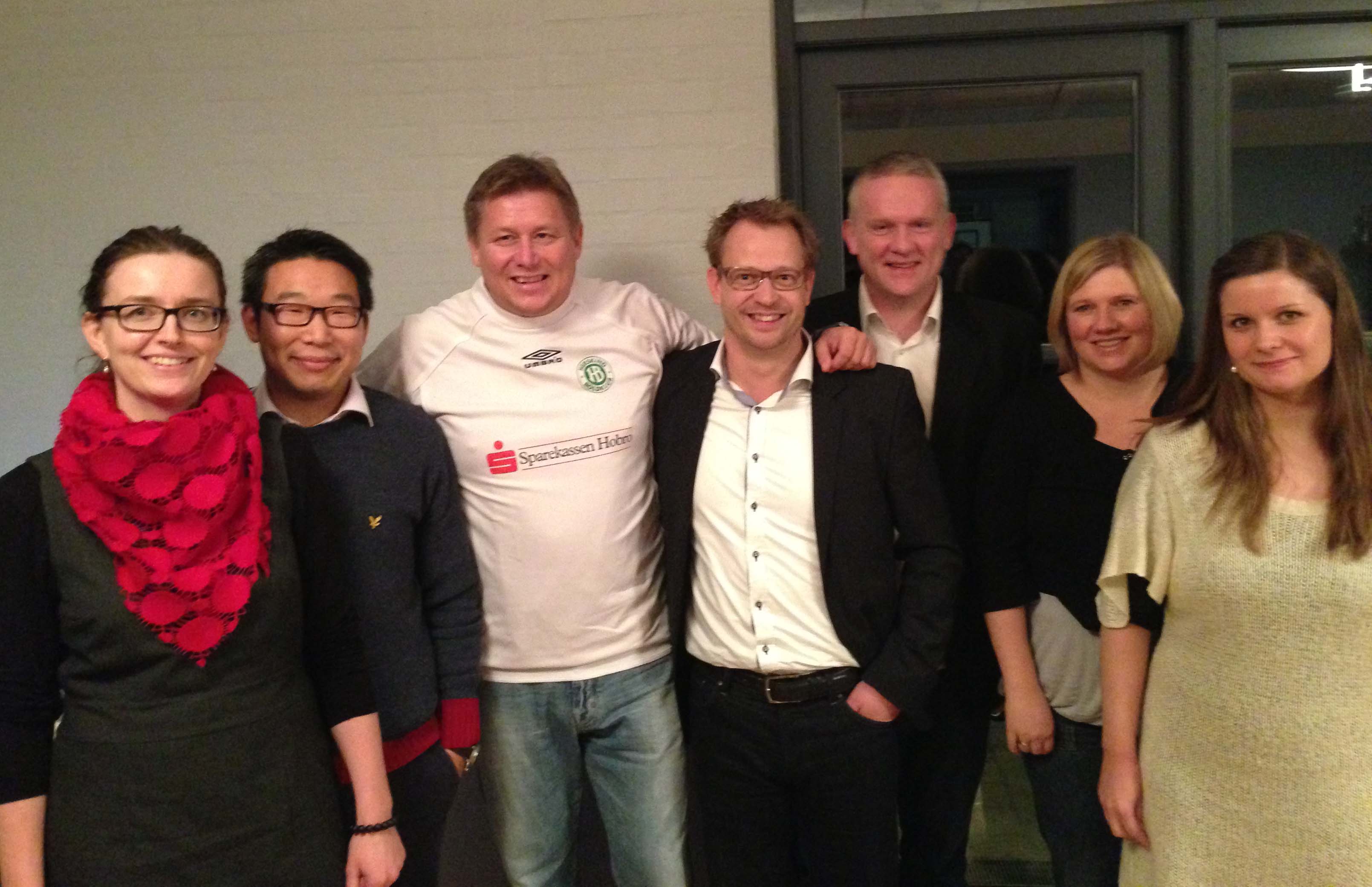 Jesper “Kasi” Nielsen fra fredag gæst ved et arrangement for Herskind Boldklubs sponsorer. På billedet ses han, iført en udebanetrøje fra Herskinds Oldboyshold, sammen med Herskind Boldklubs bestyrelse.