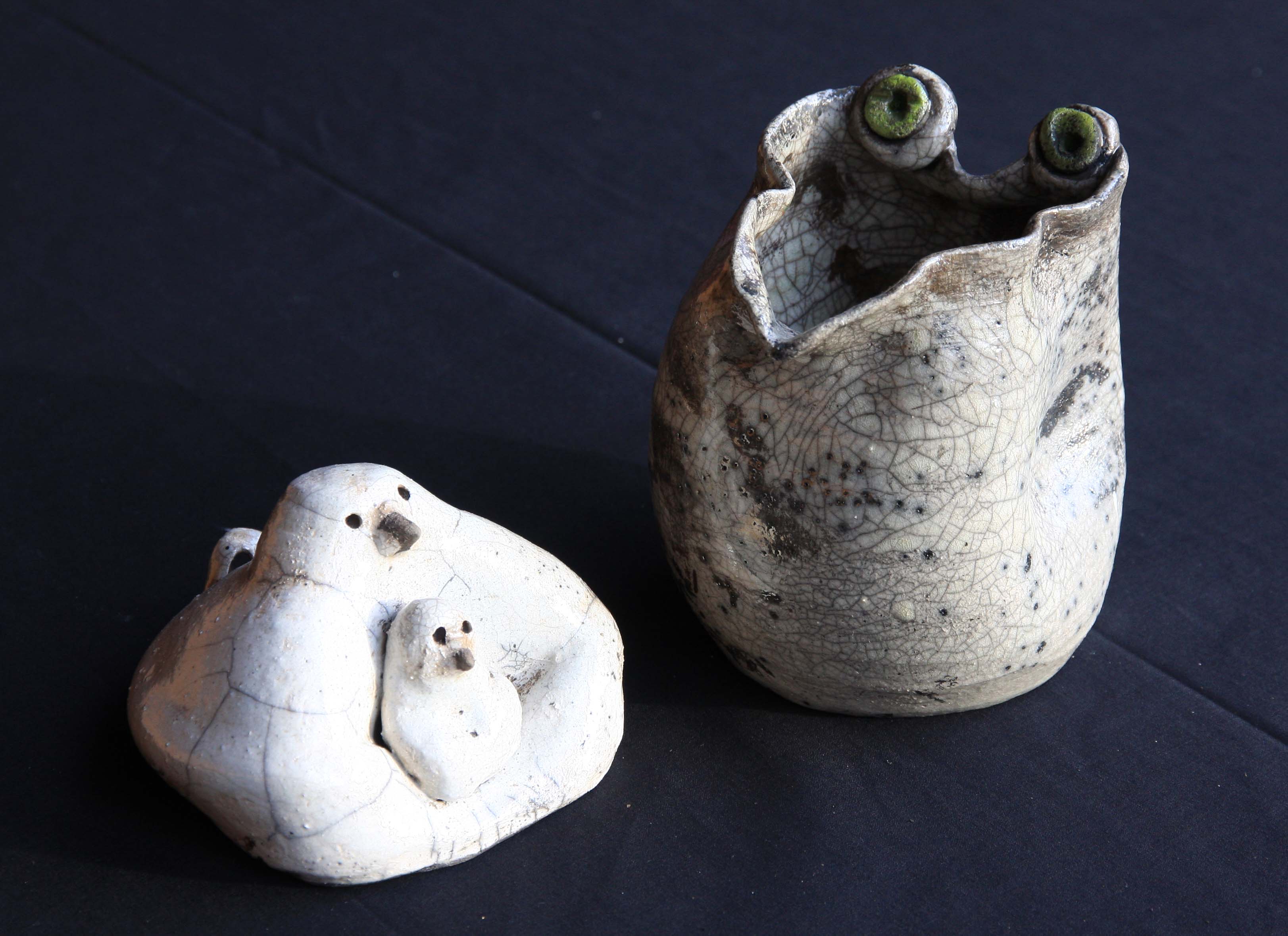 Et par eksempler på den raku-keramik som Connie Sørensen i øjeblikket udstiller i Bio Huset.