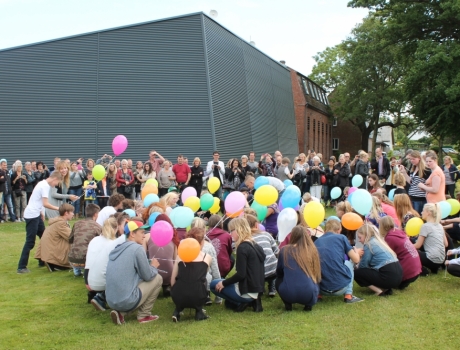 Opsendelsen af 100 heliumfyldte kæmpeballoner indgik i Klank Efterskoles skoleårsafslutning i lørdags.