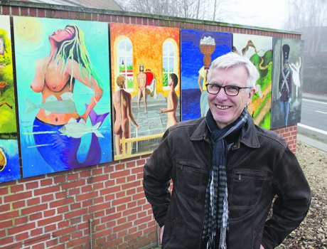 Henning Nielsen foran billedfrisen ved Torvet. En del af kunstnerne medvirker også til det kommende kunstværk i Klank Idrætsanlæg-