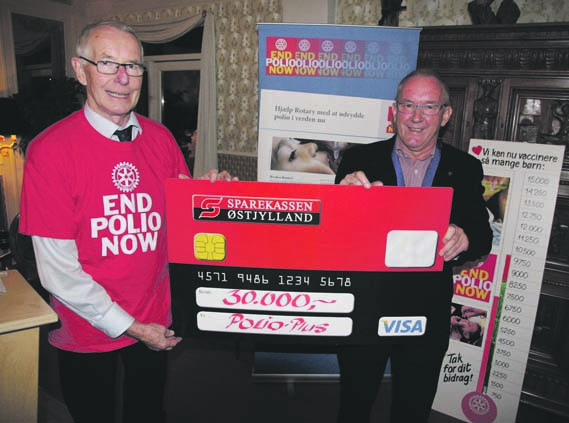 Ved en klubaften i Galten Rotary Klub i sidste uge modtog Rotary Distriktsguvernør Jørgen Eeg Sørensen en check på 30.000 kroner til Rotarys Polio Plus-kampagne.