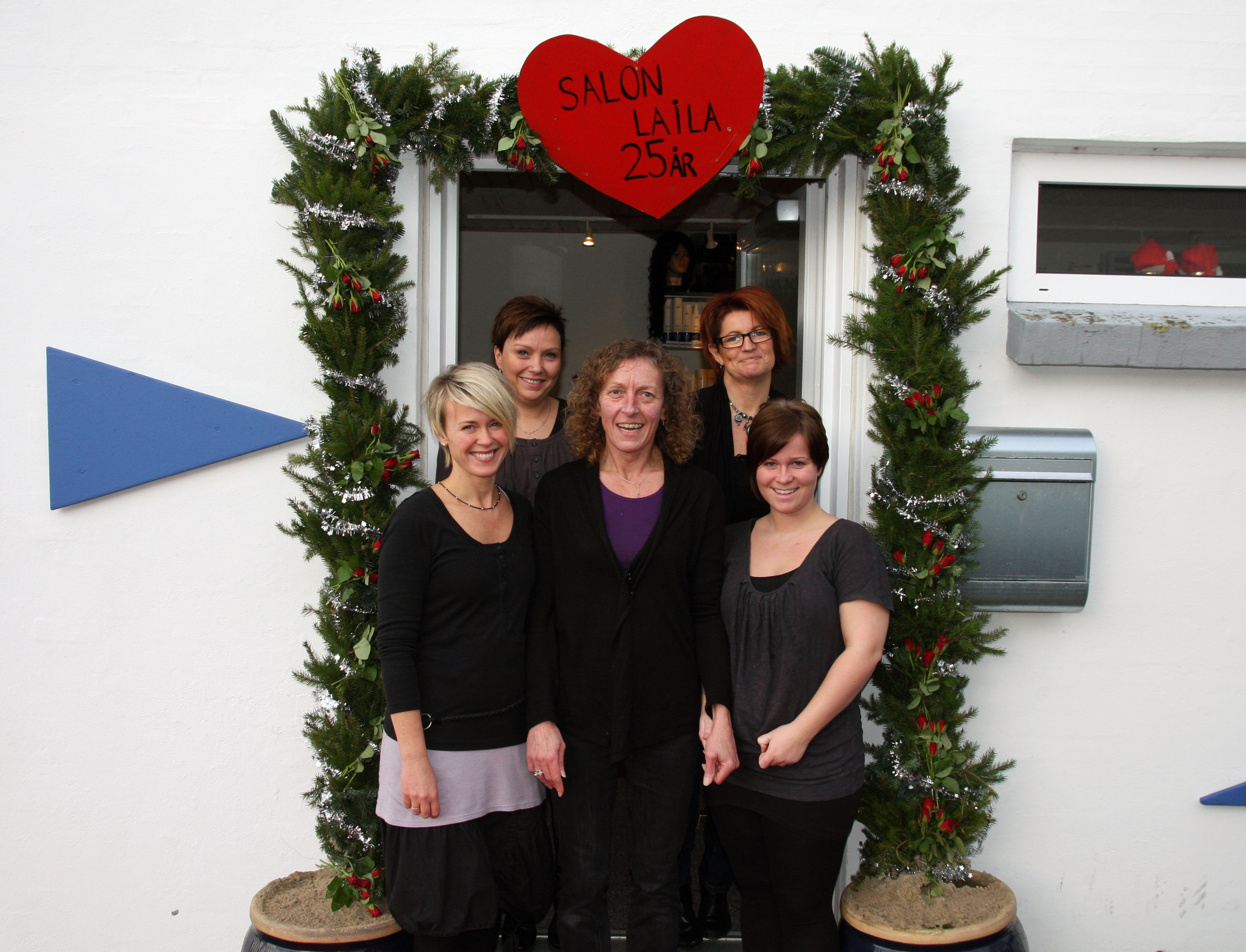 "Sølverbruden" Laila Støve i æresporten omgivet af sine medarbejdere. Jane, Sanne og Jette som har arbejdet i salonen i henholdsvis 15, 17 og 18 år, samt eleven Line. Medarbejderne havde sørget for æresporten, der var sat op tirsdag morgen til åbningstid. Selv bidrog Laila med den røde løber til ære for de kunder som i løbet af jubilæumsugen kiggede forbi.