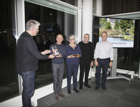 arkitekturpris til 'Initiativgruppen Præstdam'. Fra venstre ses Arne Nielsen, Ulla Christensen, Erling Thøgersen og Henrik Gade.