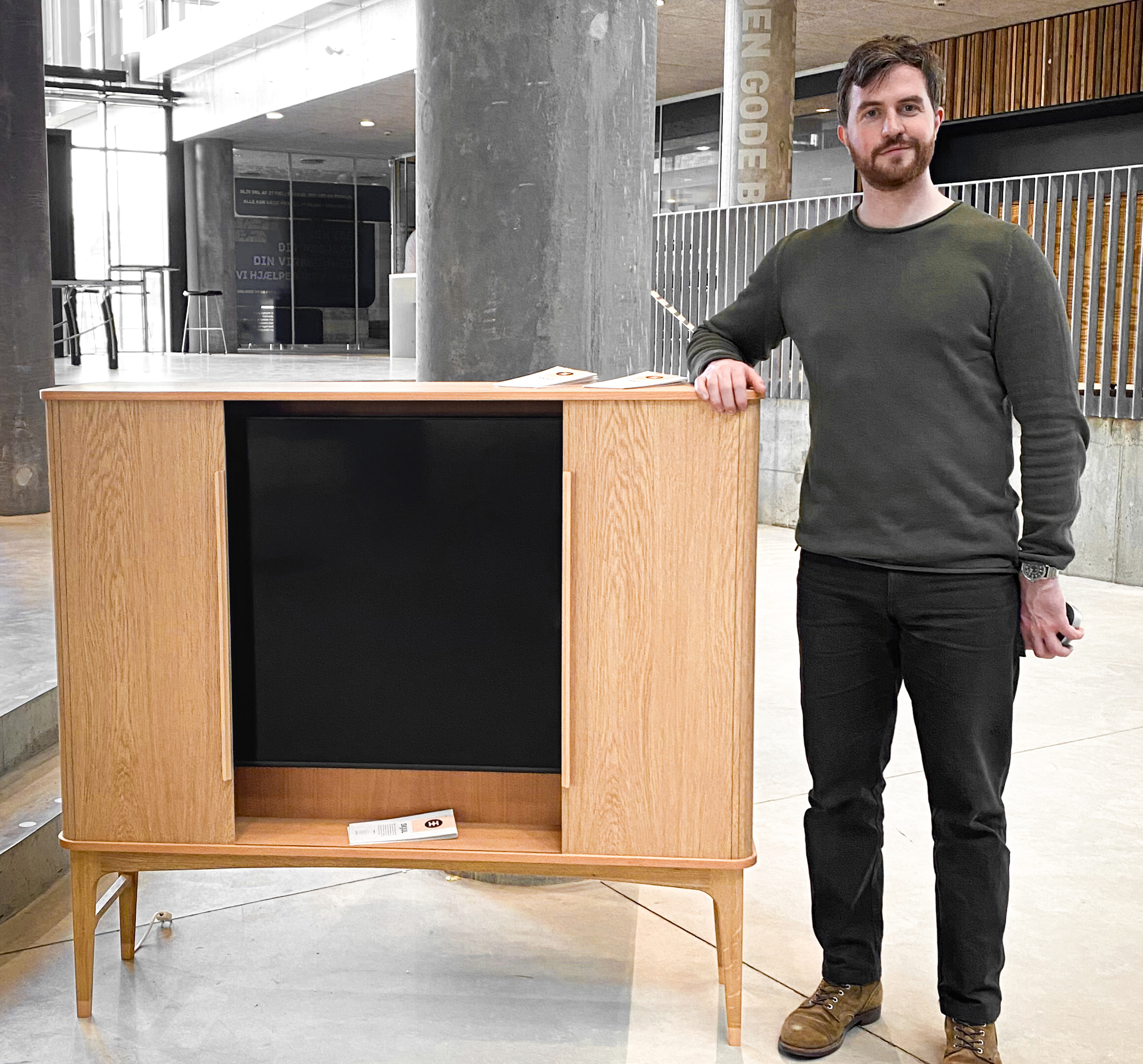 Forrige år blev Troels Schack uddannet som maskinsnedker ved Skovby Møbler med karakteren 12 og hædret med sølvmedalje af Dansk Industri. Nu har han skabt et nyt møbel, der kan skjule hjemmets skærme.