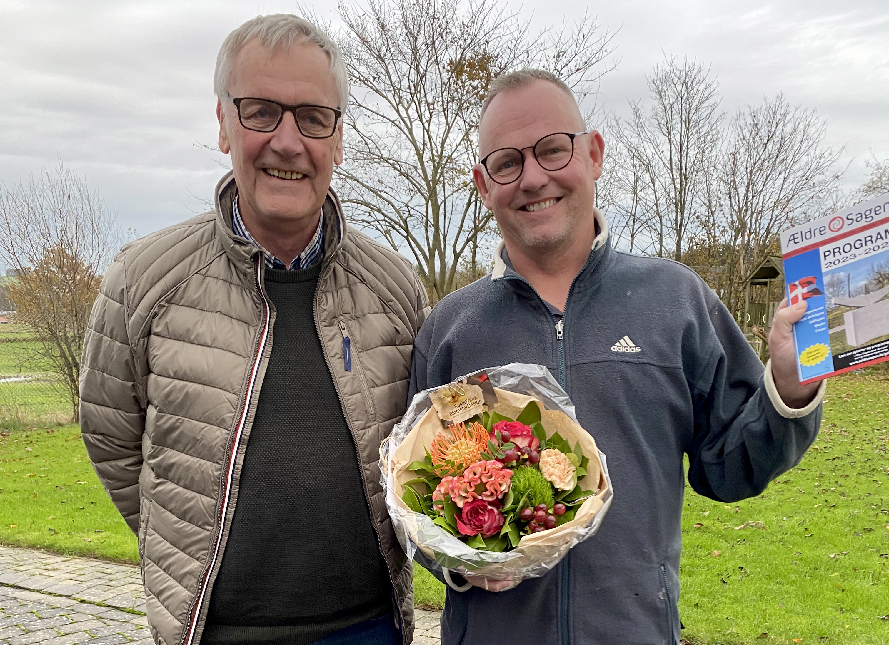 Det blev markeret med et besøg og en flot buket blomster til Peter Ørum, der blev glædeligt overrasket.