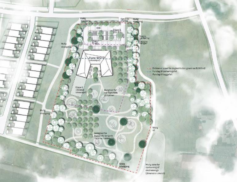 I grove træk er planen, at man tættest på Klankballevej etablerer en parkeringsplads. Umiddelbart derefter placeres selve institutionen mod syd. Den stiplede lilla linje på illustrationen markerer området, hvor selve institutionsbygningen må placeres. Hele den sydlige del af grunden skal være legeplads.