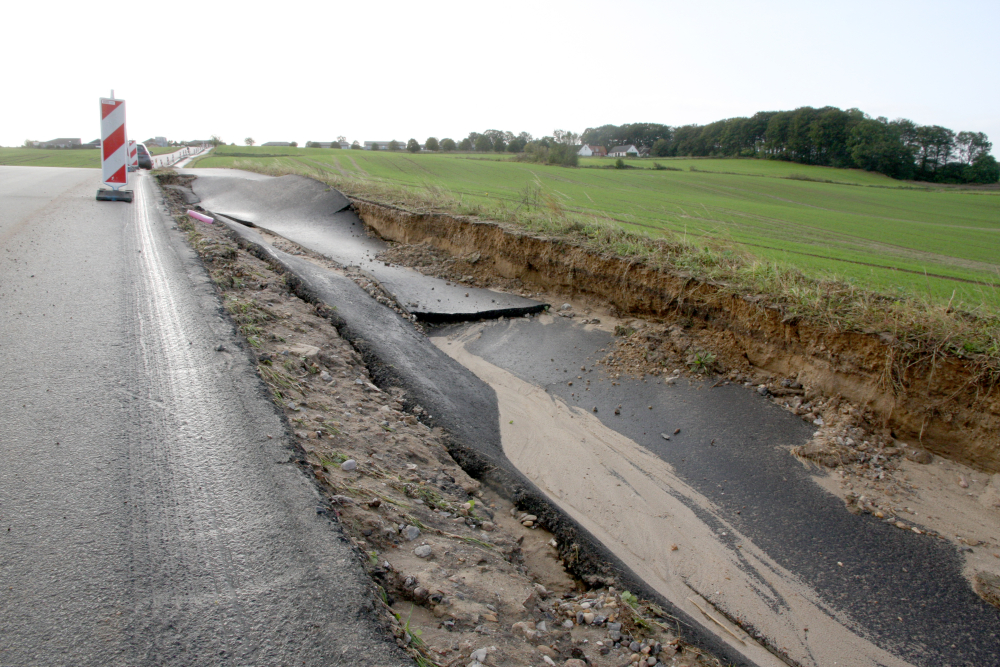 Det var et sørgeligt syn at se den nyligt renoverede cykelsti mellem Stjær og Storring, da regnvejret var ophørt. Adskillige steder var op mod en halv meter sand og jord skyllet bort og asfalten lå tilbage som flager.