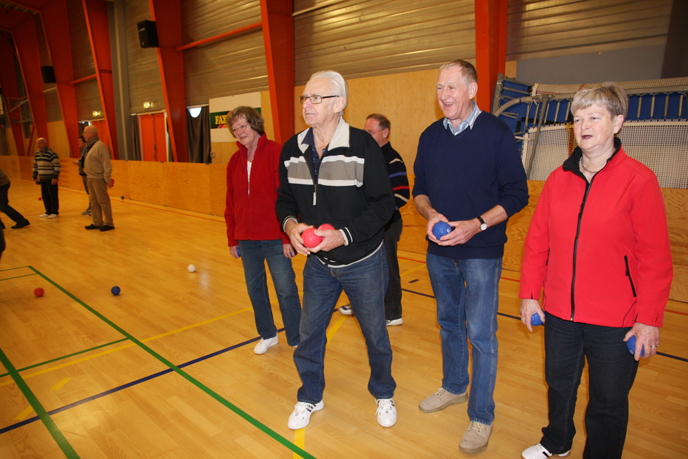 Her har over 60 efterlønnere og pensionister indtaget gulvet til vinterpetanque, hvor kuglerne, modsat udendørs petanque, er af læder.