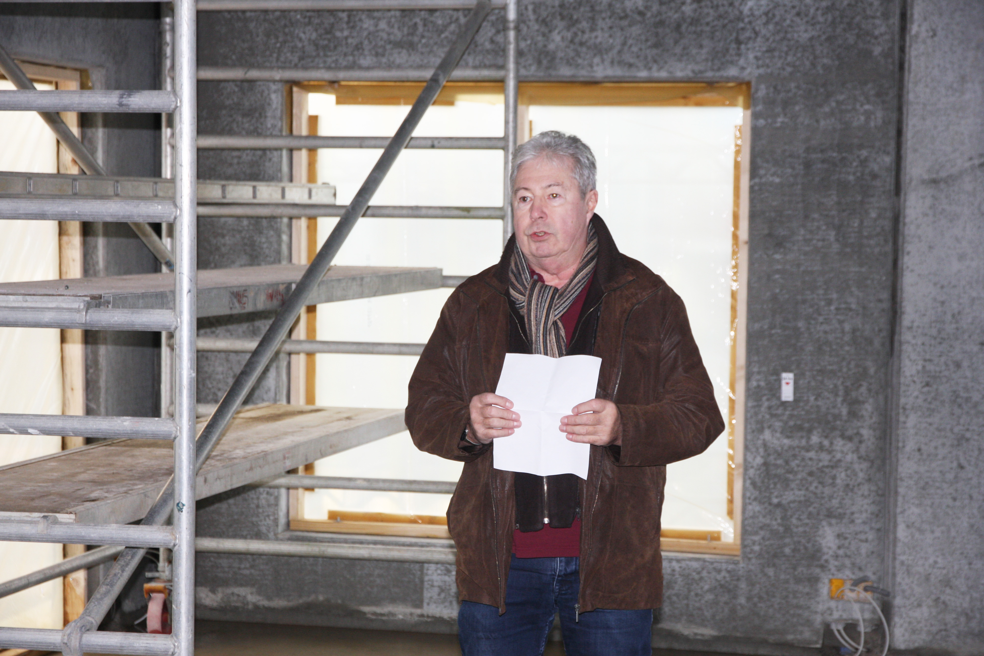 Inden de mange håndværkere og øvrige gæster blev sluppet løs ved den til formålet indforskrevne pølsevogn, talte bestyrelsesformand for AlmenBo Aarhus Chris Cully til de fremmødte i det, der ender med at blive et stort fælleshus i byggeri.