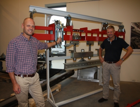 Brødrene Jens Calundan (t.v.) og Niels Calundan ejer i fællesskab Caldan Conveyor A/S og deler som administrerende direktører de forskellige ansvarsområdet i virksomheden med hovedsæde på Røddikvej i Galten samt aktiviteter verden over. 93 procent af produktionen går til eksport. Her ses de ved en miniudgave af det conveyor-system som Maersk Container Industry fornylig har afgivet ordre på.