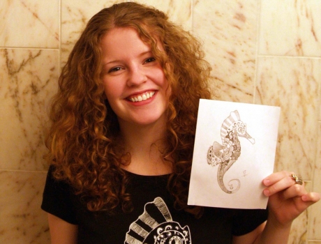 18-årige Rosine fra Skovby har vundet en helt speciel konkurrence: Hendes stregtegning af en søhest er netop blevet trykt på en T-shirtkollektion for firmaet Pieces.