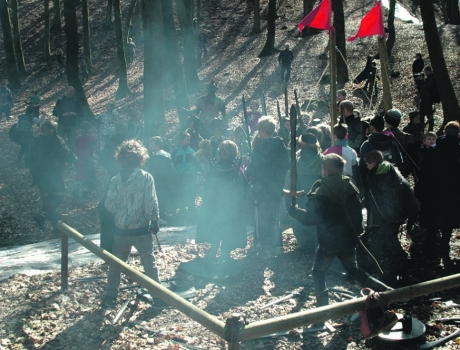 Slaget skal stå på lørdag i Bakkeskoven, hvor børn i forskellige aldre mødes for at lege med i rollespillet Ærens Mark. Her et glimt fra et tidligere rollespil i Stjær.