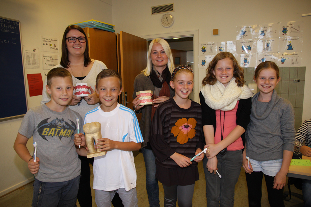 Skriveredskaberne var skiftet ud med en tandbørste hos eleverne fra 4.b på Gyvelhøjskolen forleden, da tandplejerstuderende fra Tandplejerskolen i Århus stillede skarpt på tænder og sundhed. Her har vinderne af guldtand-trofæet, på fotografens opfordring, fundet tandpasta-smilet frem.