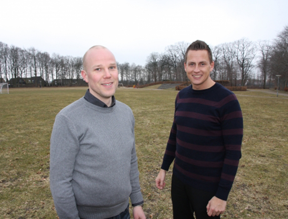 Carsten Bach fra Byfestkomiteen og filialdirektør hos Nordea Galten, Kenneth Beck på vegne af Nordeafonden, fotograferet på Bytoften, som i dagene 9.-11. maj danner rammen om Galten Byfest, herunder nyskabelsen "TEEN-Lounge".