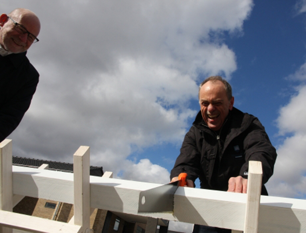 Viceborgmester Tage Nielsen slap ikke med at klippe en rød silkesnor over. Han måtte spytte i næven og ved hjælp af en fukssvans save et stykke tømmer over før Byg&Bo-udstillingen kunne åbnes. Til venstre i billedet ses viceområdedirektør hos Nordea Aarhus, Peter Bech.