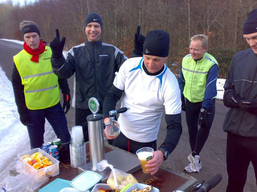 Her mødes en flok rutinerede løbere, der efterhånden har gjort en tradition ud af at afslutte årets løbesæson på festlig vis med utraditionel proviant.