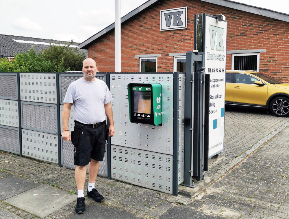 På en alvorlig baggrund har indehaveren af VK Smede- og Maskinværksted i Skovby fået monteret en hjertestarter på Ursusvej.