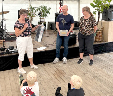 Storring Pilelaug afslørede søndag en gave til Stjærskolen – en pilefletskulptur, som forhåbentlig kan holde længere end de par år den forventes at holde stand mod vind og vejr.