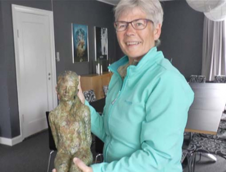 Tove Severinsen fra skulturudstillingens initiativgruppe med skulpturen Adolescente, der forrige torsdag blev væltet på hjørnet ved Nordea i Galten.