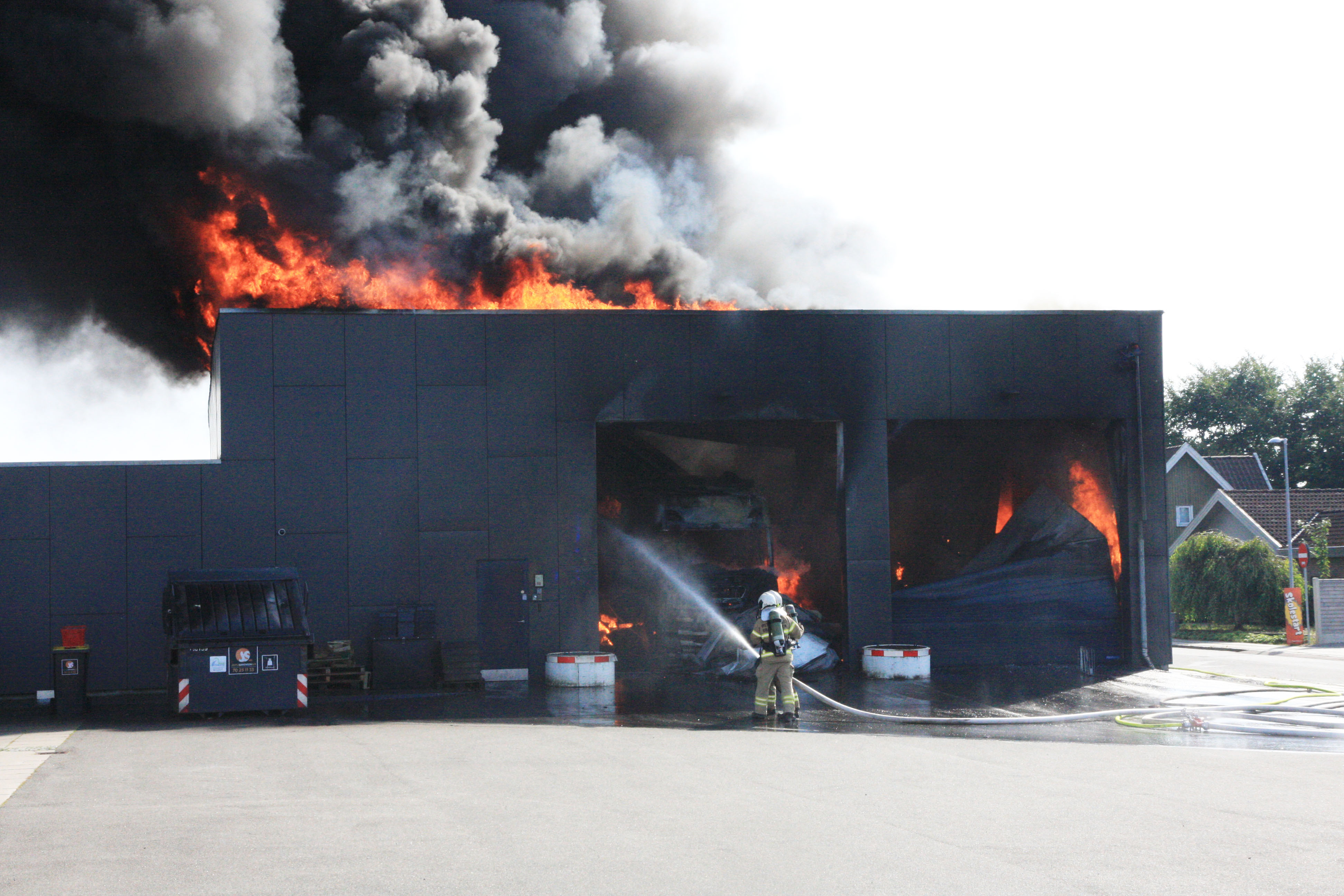 Adskillige brand- og redningskøretøjer var hurtigt fremme. Branden udviklede sig hurtigt og inden længe var tagkonstruktionen på lagerhallen overtændt.