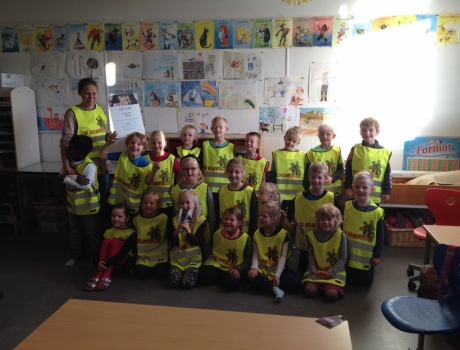 0.a. på Låsby Skole i de trafikveste som eleverne modtog i præmie fordi de vandt årets skolestartskonkurrence i Skanderborg Kommune.